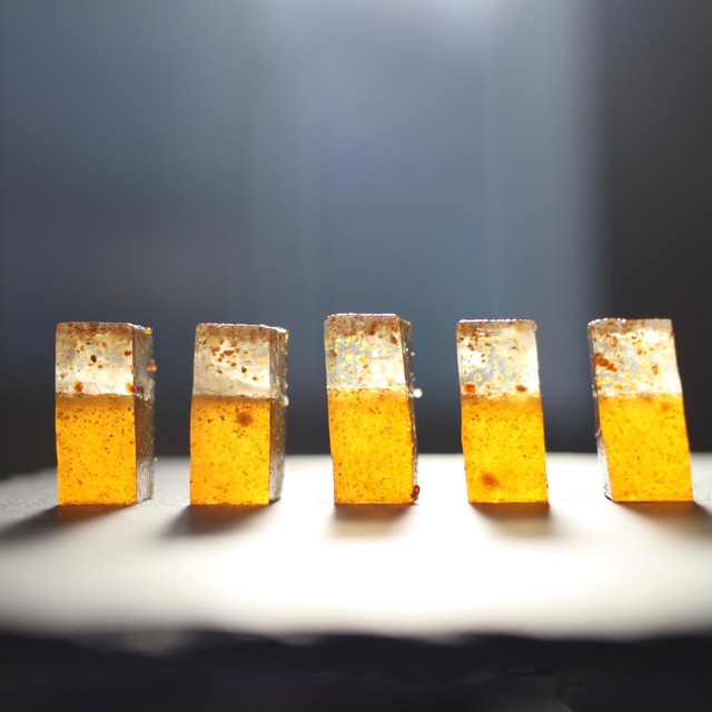 一方で透き通る中に散りばめられた粒が美しい白層は、シャリっとした琥珀糖らしい食感と荒目の堂上蜂屋柿の粒感があり、紅層とはまた違う楽しさがあります。