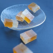 一方で透き通る中に散りばめられた粒が美しい白層は、シャリっとした琥珀糖らしい食感と荒目の堂上蜂屋柿の粒感があり、紅層とはまた違う楽しさがあります。
