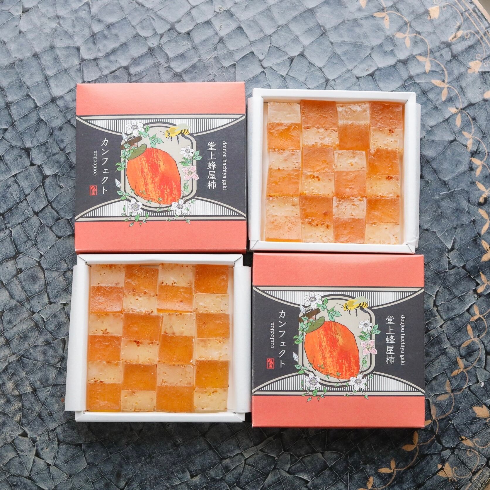 堂上蜂屋柿カンフェクトは見た目に楽しく縁起も良い紅白の二層仕立ての琥珀糖です。柿そのものの色合いをした紅層は、堂上蜂屋柿の細かいパウダーがしっかりと生地に練り込まれていて、もちっとした食感と堂上蜂屋柿の奥深い味わいが楽しめます。